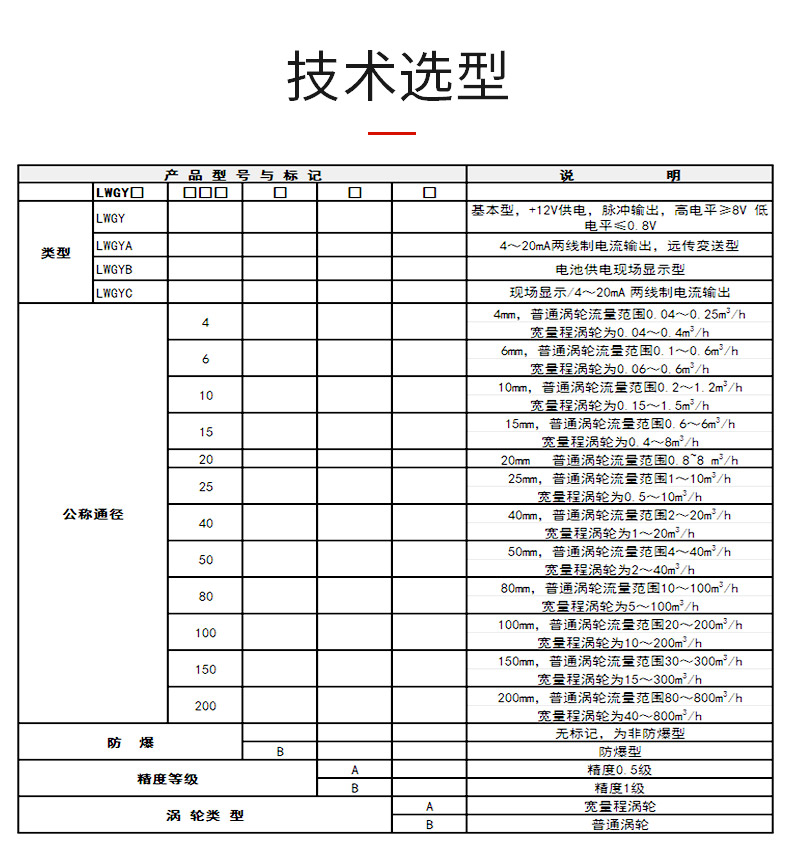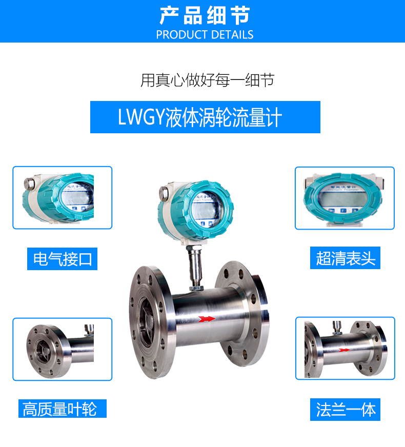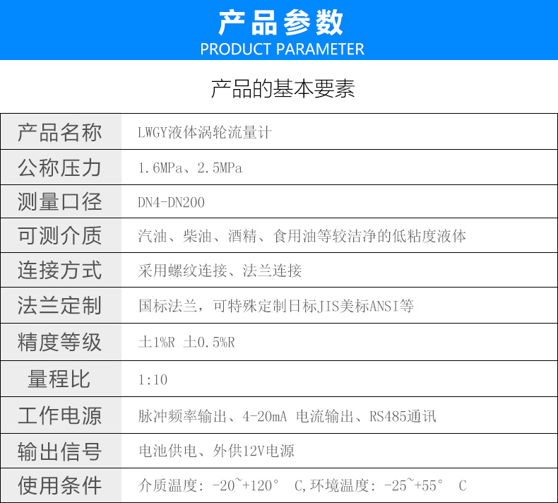 LWGY系列液體渦輪流量計傳感器基于力矩平衡原理,屬于速度式流量儀表。傳感器具有結構簡單、輕巧、精度高、復現性好、反應靈敏,安裝維護使用方便等特點,廣泛用于石油、化工、冶金、供水、造紙等行業,是流量計量和節能的理想儀表。傳感器與顯示儀表配套使用,適用于測量封閉管道中與不銹鋼1Cr18Ni9Ti、2Cr13及剛玉Al2O3、硬質合金不起腐蝕作用,且無纖維、顆粒等雜質的液體。若與具有特殊功能的顯示儀表配套,還可以進行定量控制、超量報警等。選用本產品的防爆型式(ExmIIT6),可在有 危險的環境中使用。